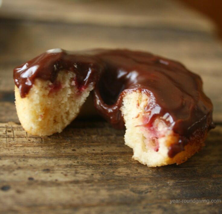 Vanilla strawberry mini donuts baked with fresh strawberries and then frosted with a milk chocolate ganache.