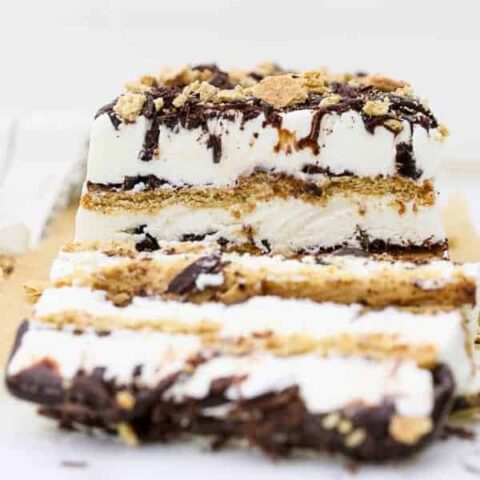 Satisfy your s'mores craving with this easy, no-fuss No-Churn S'mores Ice Cream Cake. With layers of honey graham crackers, no-churn marshmallow ice cream, and topped with loads of decadent chocolate shavings, this delicious cake is sure to please all s'mores lovers.