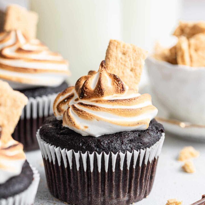 Chocolate cupcakes with a graham cracker crust topped with a toasted marshmallow frosting.