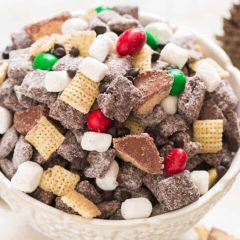 We eat this stuff by the handfuls! Classic puppy chow snack mix with a smores twist!