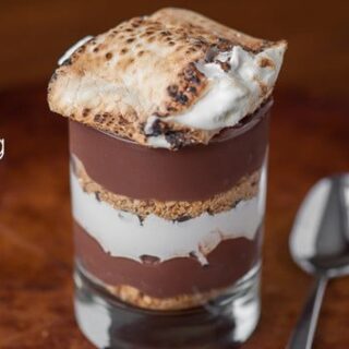 5 minutes for a Smores-inspired dessert. Layers of chocolate pudding, marshmallow cream, chocolate chips, graham cracker, and a big toasted marshmallow on top!
