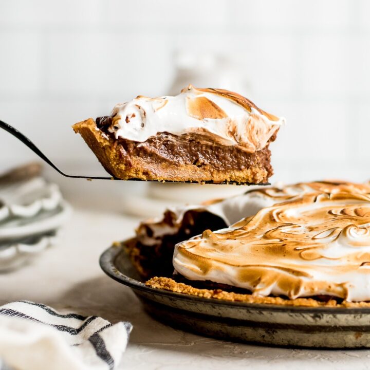 Freshly toasted homemade marshmallows tops this creamy delicious dark chocolate ganache pie with a graham cracker crumb crust.