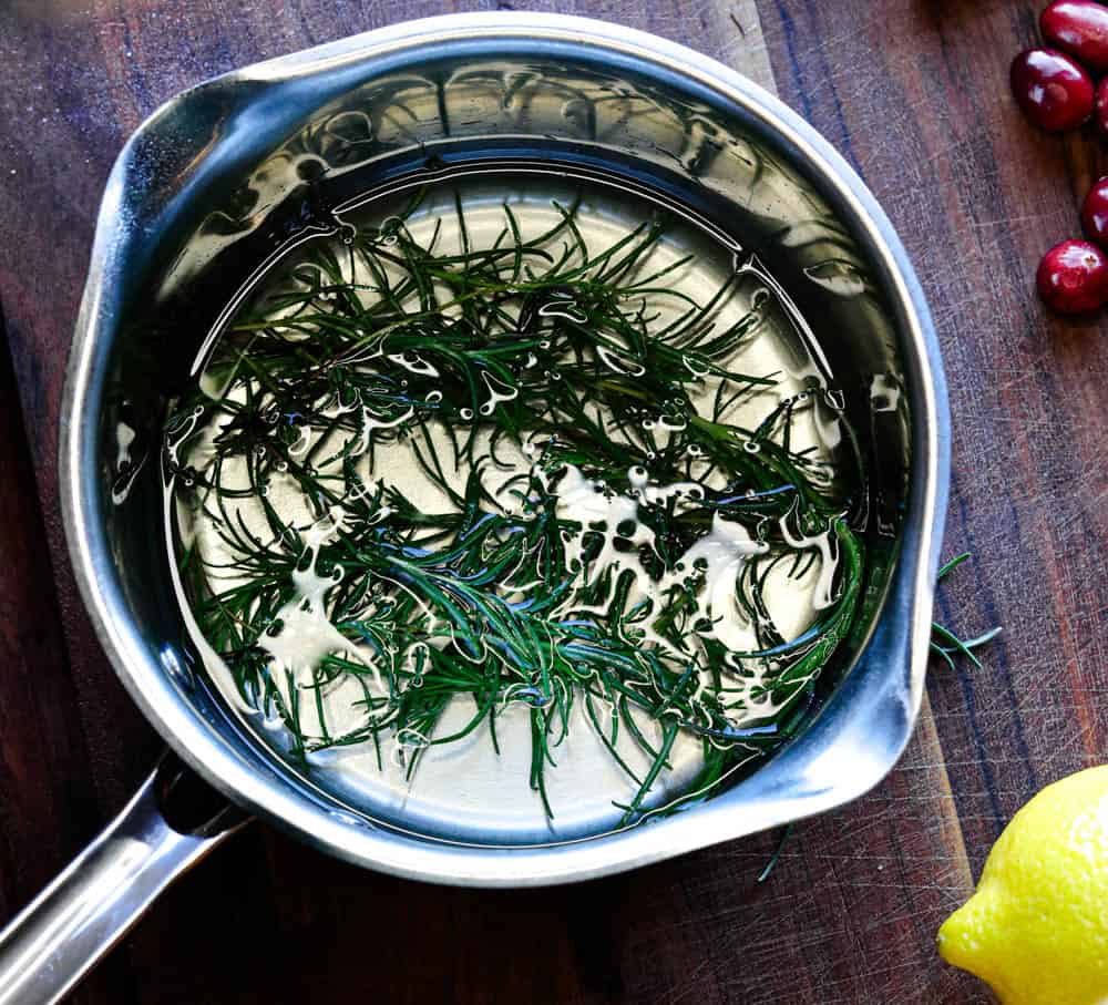 I dunk my rosemary right into the cooled pot of simple syrup. Just long enough for the syrup to form a slick coat, not long enough for them to go limp.