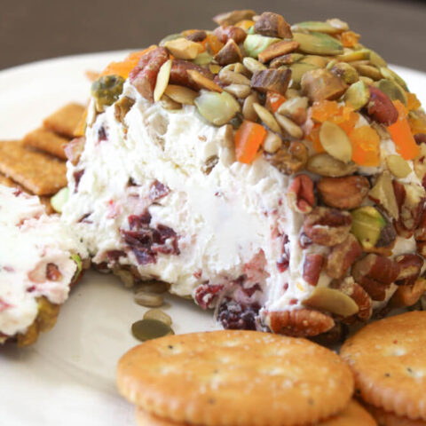 This Fall Harvest Cheese Ball recipe is jeweled with seasonal nuts and seeds. On the inside, it bursts with craisins within two creamy kinds of cheese.