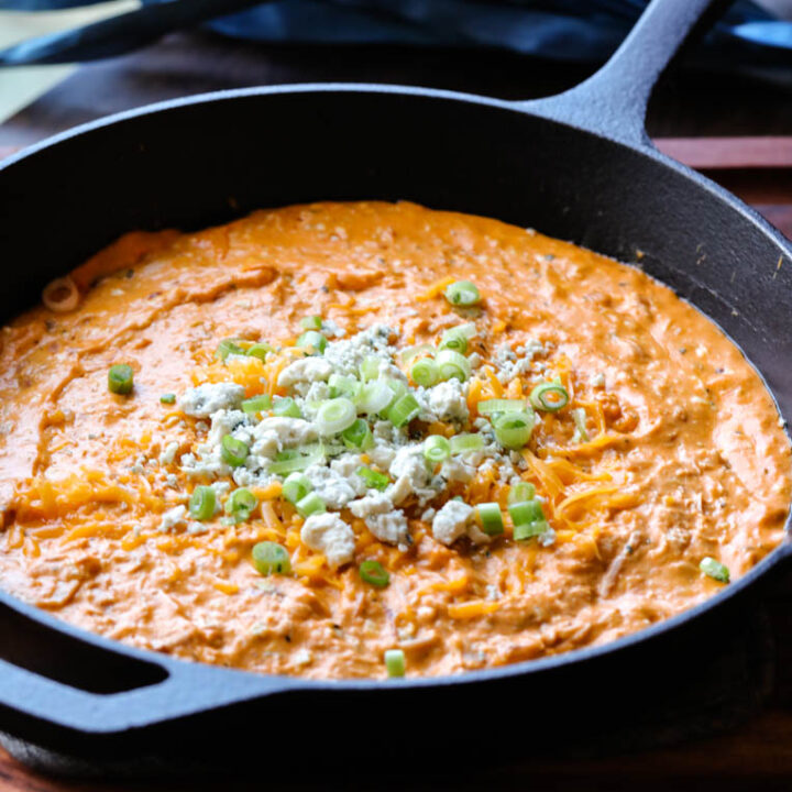 This is the Ultimate Smoked Buffalo Chicken Dip Recipe. Loaded with smoked chicken the dip is super smoked for 30 minutes fully infusing the smokey flavor into the dip. Then it is topped with green onions and blue cheese. Serve this this super smokey Buffalo Chicken Dip with crackers, pretzels, or celery & carrots.